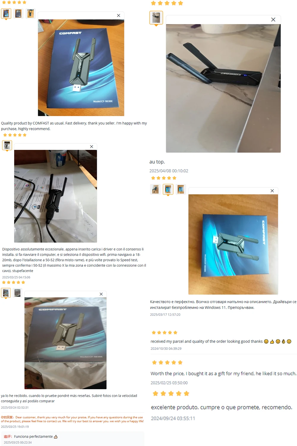CF-983BE and CF-987BE are a BE6500 WiFi7 dual-antenna driver-free wireless network card, which automatically installs the driver; 6500Mbps high-speed rate, supports 2.4&5&6GHz tri-band; dual-antenna design, improved signal penetration ability; WiFi7 technology, network delay and channel interference are greatly reduced , you can enjoy a smooth gaming experience in highly crowded environments and meet users’ high-end network needs!
